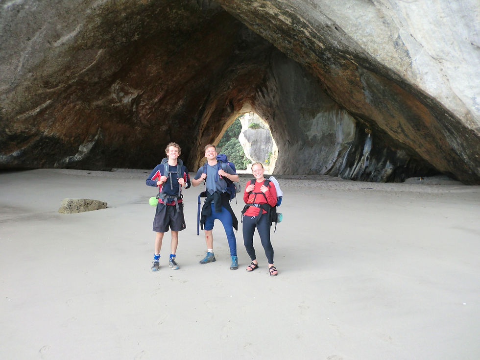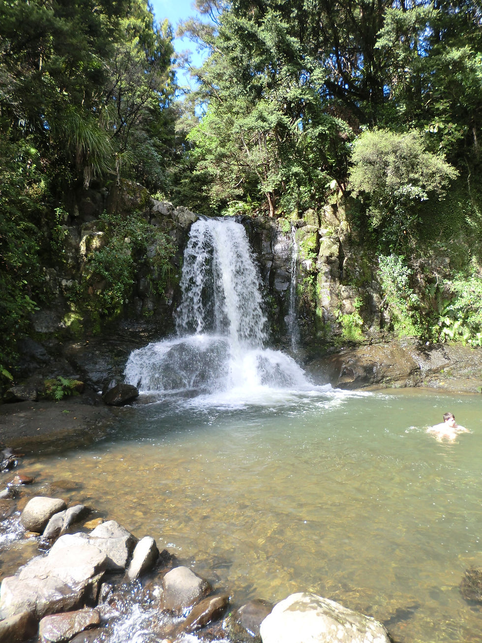 The clue is in the name with Hot Water Beach. When the tide is far enough out, it is possible to dig a hole in the sand and it will fill itself with hot water. We walked down a path, illuminated by glow worms to get to the beach. The fact that it was so late in the day meant we could reuse holes that other people had dug (we also didn’t have a digging implement). We spent about two hours enjoying the hot water, running into the sea, disturbing the phosphorescence in the water and running back to the warmth. We were somewhat covered in sand when we left and it had started to rain by the time we reached camp an hour later. We pitched our tents in the dark and went to sleep. It had rained all night, thankfully my tent had survived its first outing, but the clay on the ground held the water well and Charlotte happened to be sleeping in a small hole which meant she woke in a puddle. We packed up the tents in a hurry, went for a quick hike up castle rock (a peak near where we camped), but it was still very foggy so we couldn’t see much. We left Harry there to do some rock climbing while the remaining three drove to the beach. On the way, we couldn’t help but go for a swim in a waterfall we spotted.