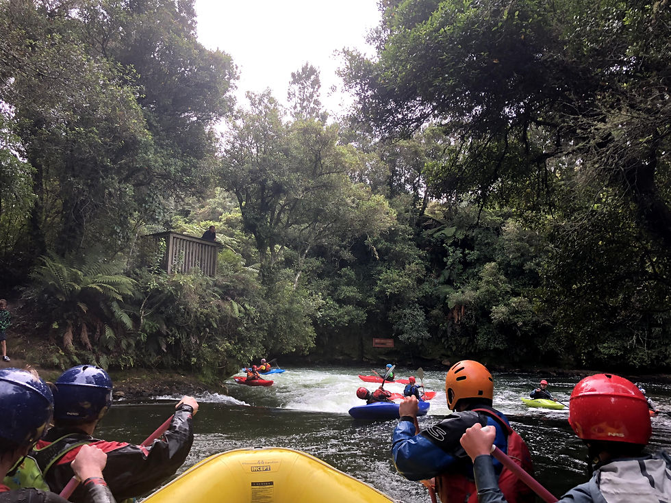 I was collected by Jasmine (a senior member of the Kayak club) at 06:30 on Saturday morning to go to the gear shed as I was going to be spending the weekend rafting and kayaking. When we were about 10min away from the river we got a call asking if we had the paddles as none had been packed. We did not. Thankfully we were able to borrow some from the commercial rafting company and we were good to go. We were rafting Kaituna river near Rotorua. After descending two small waterfalls, including a weir, we came to ‘two-tier’ which, at 7m, is the highest commercially rafted waterfall in the world. We managed to keep the raft upright but we lost our guide, Justus, and Maddie. To make the whole thing even more dramatic, Marayke had blood streaming from her nose and a massive grin on her face. We got our lost paddlers back to the boat and pulled them in. All seemed fine. Then, as Maddie tried to stand up she dislocated her knee. Thankfully it relocated but she was in a lot of pain. Jasmine took control of the situation, splinted her leg with a paddle and sat her across the middle. While Jasmine tried to support Maddie, Justus, Marayke and I had to try paddle the raft down the rest of the grade four as smoothly as possible. Despite the drama, I enjoyed the teamwork in a crisis. We managed to get her down and carried her to the car to bring her to hospital.