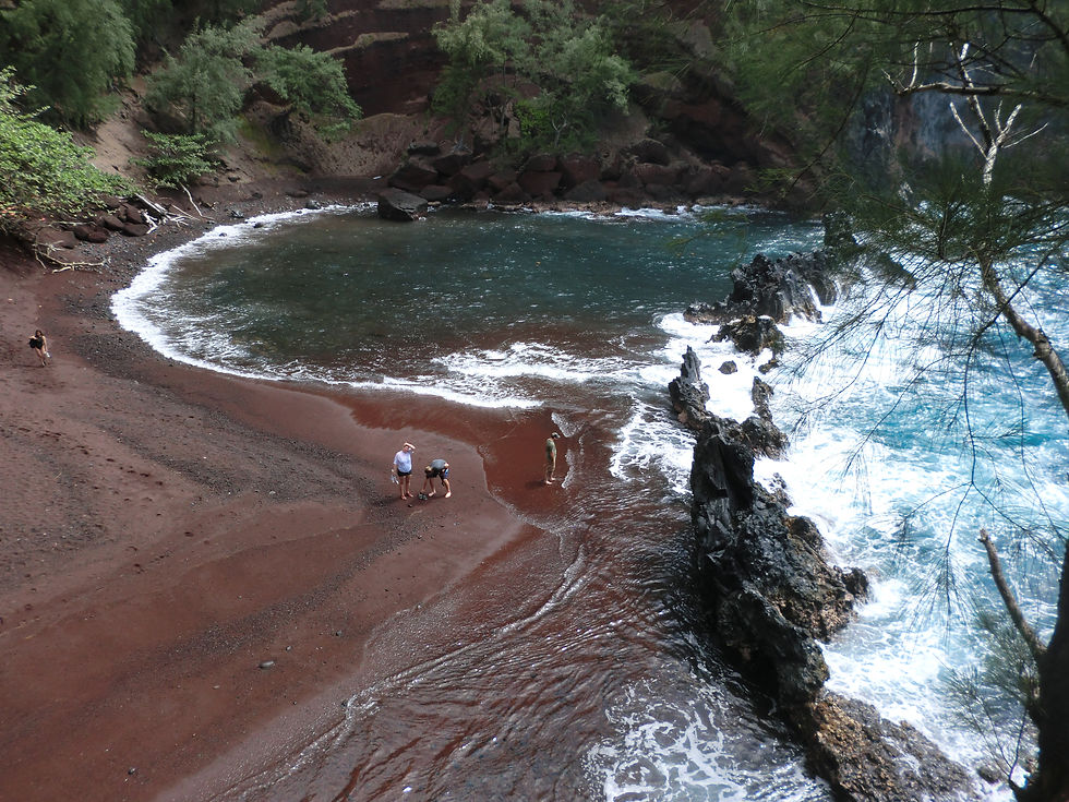 Tuesday 26th June, I woke the girls at 06:30 so we could hit the road. Once the tents were packed (again no help from Sia) we ate the overnight oats I made (Sia seemed very upset that I hadn’t packed more than one spoon). Once back on the road we were trying to find a waterfall to jump off, so anytime we saw an entrance Rahel and I went climbing and exploring in search of our goal. It was so much fun but we didn’t find anything. Each time we stopped we seemed to have to wait an age for Sia to get her stuff in order. When we reached Hana for the second time we went to red sand beach. It was more stones than sand but still beautiful with a lagoon closed in from the sea by big rocks. Rahel and I went swimming and snorkelling while Sia put on suncream and took photos. I saw many beautiful fish including rainbow and angel fish and an eel. It was a big step for Rahel who has a phobia of fish. We went to another beach first to wash my pots and paddle (the waves were too big to swim) again Sia took photos instead.